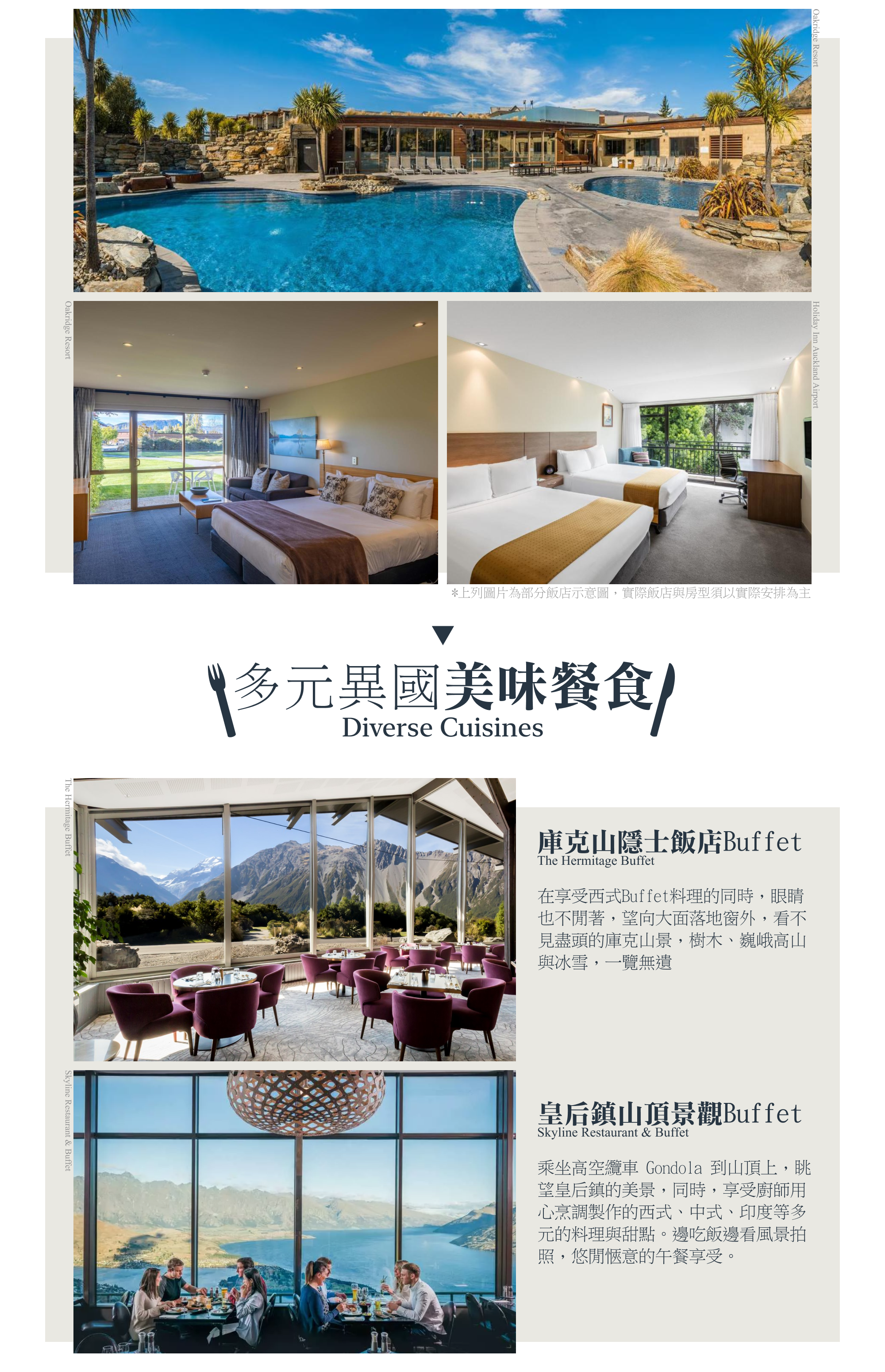 ►住宿:QUEENSTOWN: SUDIMA ZQN 5 MILES或HOLIDAY INN ZQN REMARKABLES PARK或MILLENNIUM HTL ZQN或COPTHORNE HTL ZQN或 WANAKA: EDGEWATER RESORT WANAKA或OAKRIDGE RESORT WANAKA或同級